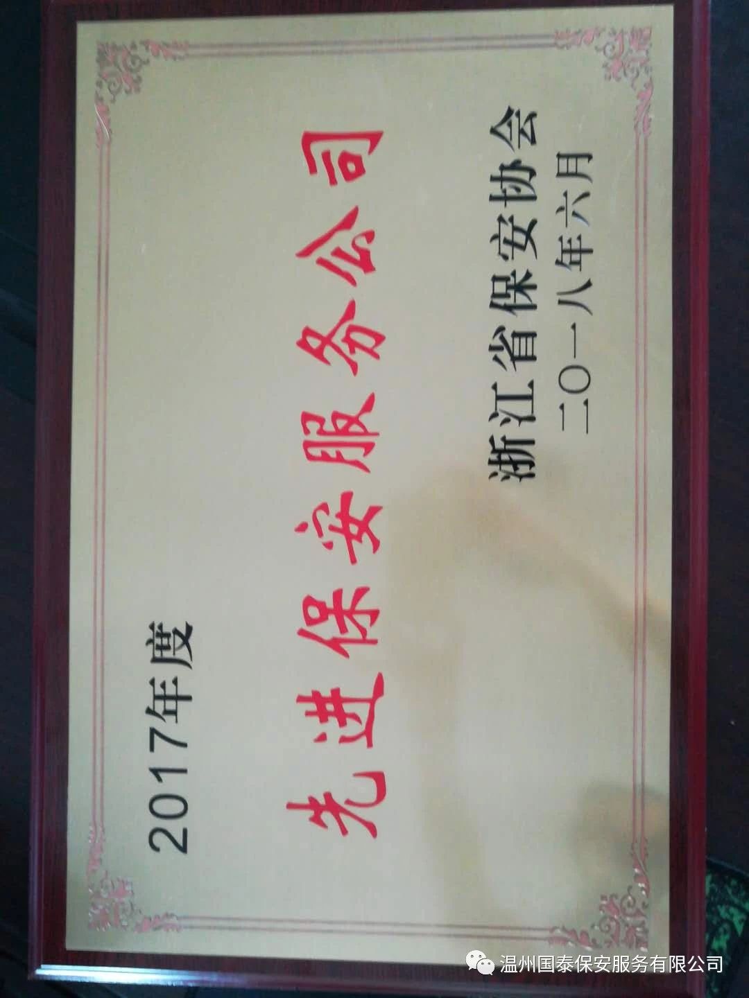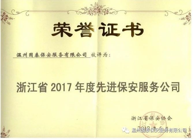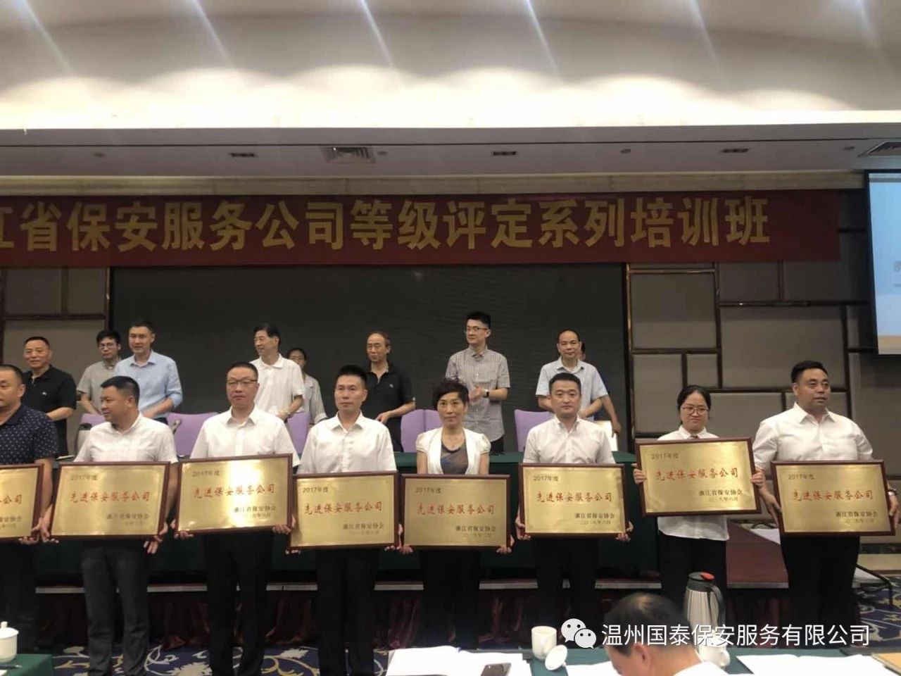 在表彰會上,溫州國泰保安服務(wù)有限公司被評為2017年度浙江省先進保安服務(wù)公司,公司保安員楊庭旭被評為2017年度浙江省優(yōu)秀保安員.