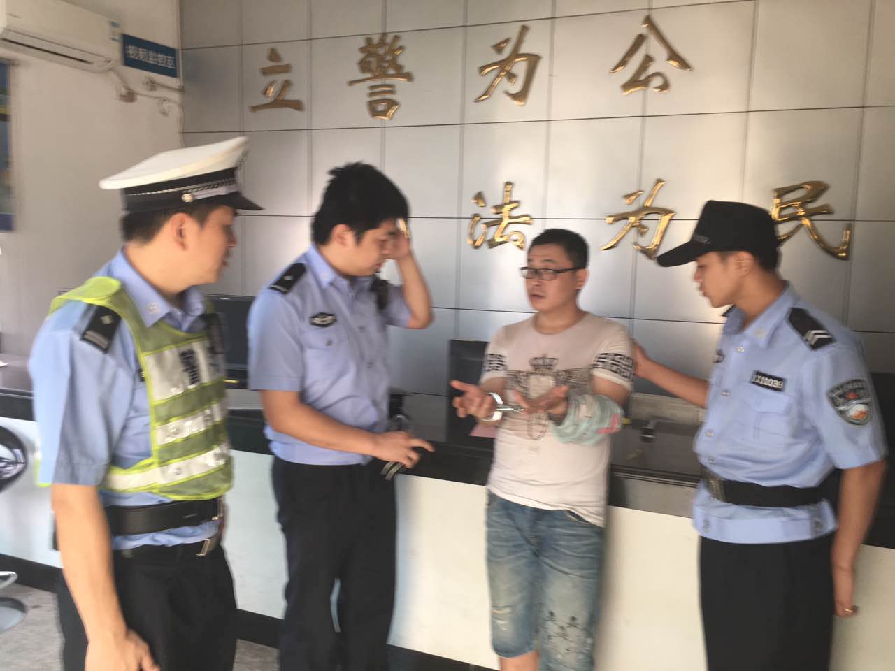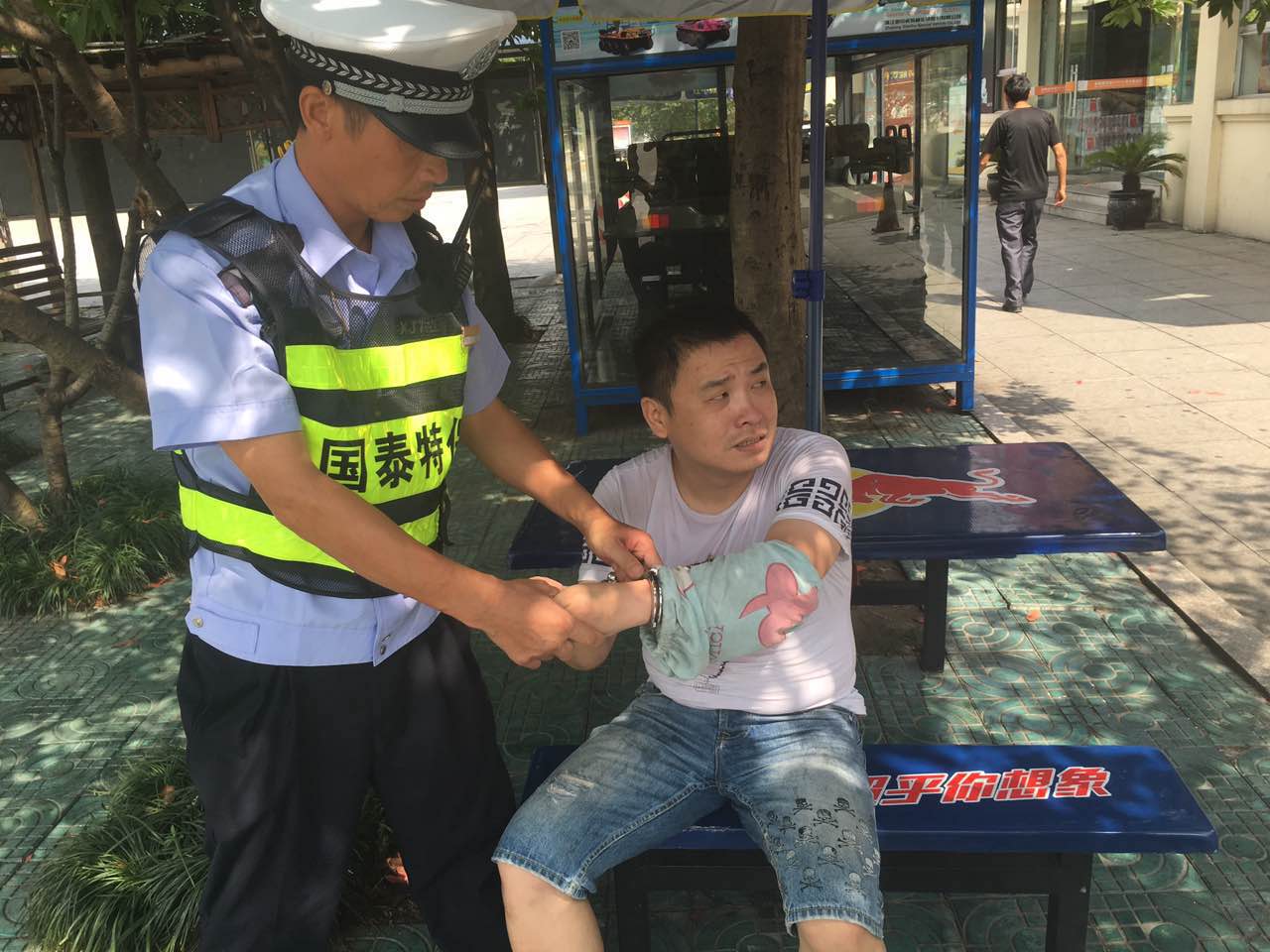 8月10日上午9點(diǎn)20許,青田服務(wù)區(qū)現(xiàn)場(chǎng)管理員在金華方向發(fā)現(xiàn)從貨車(chē)下來(lái)一名男子,滿頭大汗,神色慌張,馬上前去查問(wèn)。該男子一會(huì)說(shuō)有人拿子彈打他,又說(shuō)有人用激光射他,前言不搭后語(yǔ)有吸毒嫌疑。經(jīng)過(guò)進(jìn)一步了解,男子說(shuō)自己駕駛一輛出租車(chē)從溫州過(guò)來(lái),在沒(méi)到青田服務(wù)區(qū)的一個(gè)山洞口時(shí)發(fā)生車(chē)禍,于是攔了一輛貨車(chē)進(jìn)服務(wù)區(qū)。工作人員馬上聯(lián)系指揮中心,卻得到指令,一名穿白色短袖身高1米7男子的男子是吸毒持刀搶出租車(chē)的逃犯,正逃往麗水方向,如有發(fā)現(xiàn)要求馬上把他控制起來(lái)。經(jīng)過(guò)跟指揮中心確認(rèn),眼前該男子就是犯罪嫌疑人,青田服務(wù)區(qū)馬上啟動(dòng)防暴應(yīng)急預(yù)案,現(xiàn)場(chǎng)主管立即帶領(lǐng)國(guó)泰保安駐派服務(wù)區(qū)保安隊(duì)長(zhǎng)(阮蘇彬)趁其不備,一擁而上將其控制后交給警方處理。